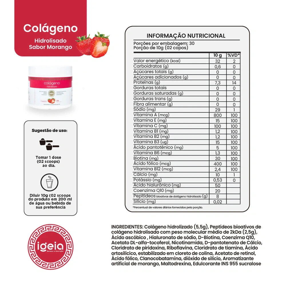 Com um irresistível sabor de morango, o colágeno Igeia oferece uma solução prática e saborosa para o cuidado da sua saúde. Cada pote de 300g contém 30 porções, perfeitas para incluir na sua rotina e obter um boost diário de vitalidade.